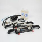 GM2-MRA03 pump (art. X.343 standard square bezel kit included) + 1 MC300HD cylinder + 1 MC300HD2 cylinder + brass fittings (1 kit GTN7X10916ORB + 1 Kit AC38/T916) + 2 lt. oil hydraulic + 2 x 7,5 mt. SAE 100 R7 5/16 hoses with fittings pressed on one end.
