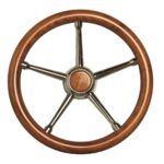 Steering wheel in stainless steel with teak handgrip Ø 350 mm.