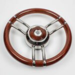 Steering wheel in stainless steel with mahogany handgrip Ø 350 mm.