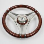 Steering wheel in stainless steel with teak handgrip Ø 350 mm.