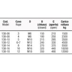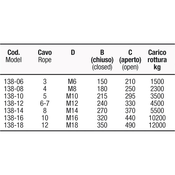 | Articolo | Cavo (mm.) | D | B (mm.) - chiuso | C (mm.) - aperto |