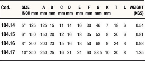 | Articolo | Dim. (pollici) | Dim. (mm.) | A (mm.) | B (mm.) | C (mm.) | D (mm.) | E (mm.) | F (mm.) | G (mm.) | K (mm.) | T (mm.) | L (mm.) | Peso (Kg.) |